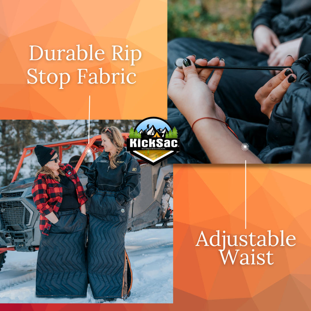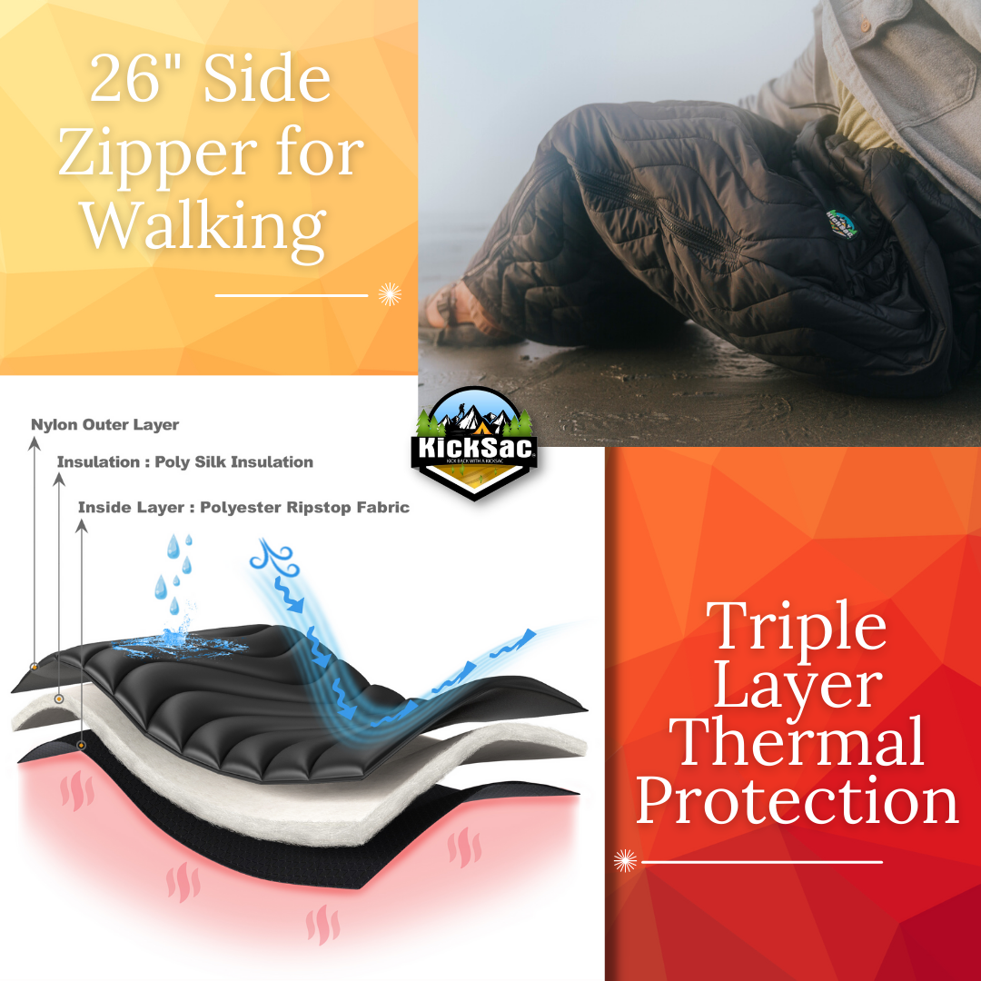 🧗♂️ **Adventure-Ready Design:** Built to endure, KickSac's rugged, abrasion-resistant fabric withstands the toughest conditions. Wear it over your boots with ease—its open bottom design allows free movement while keeping you cozy. Also, the 26" side zipper allows for the freedom of movement without having to take the KickSac™ off and retain your body heat.